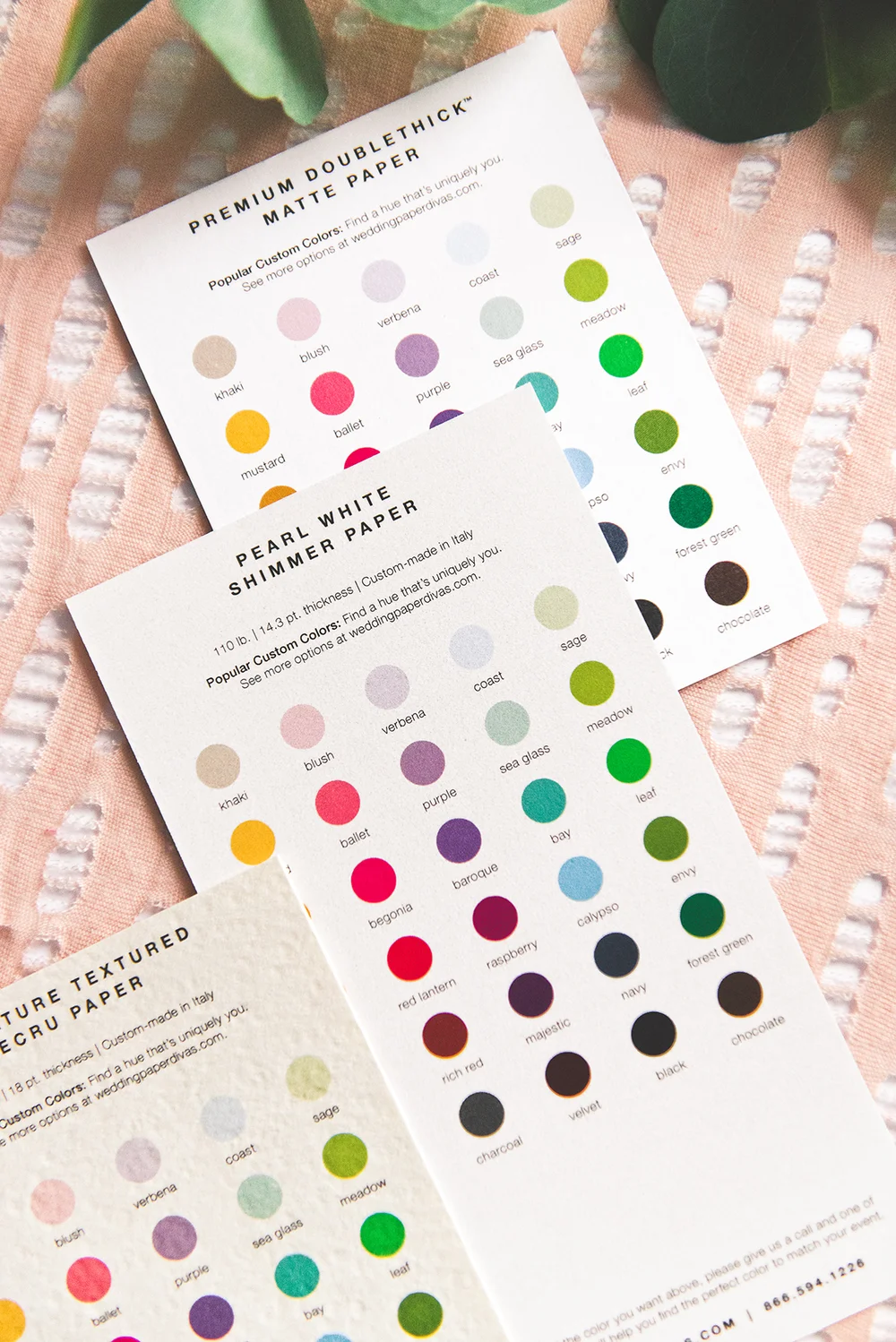 Get 8 free wedding stationery samples from wedding paper divas: Even stationers like wedding paper divas can send you a sample kit so you know exactly what to expect. You get an in person look at colors, fonts, types of paper and a variety of printing styles.
