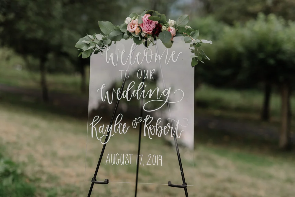 Acrylic signs are trending in the world of wedding decorations, but that doesn't mean there isn't a way to revamp the idea. Give your wedding a personalized touch with beautifully designed save the date cards, wedding invitations, welcome to the wedding posters, thank you cards and more. This couple ensured their acrylic wedding welcome sign felt totally unique and fresh by hanging it from a metal structure instead of simply placing it on an easel.